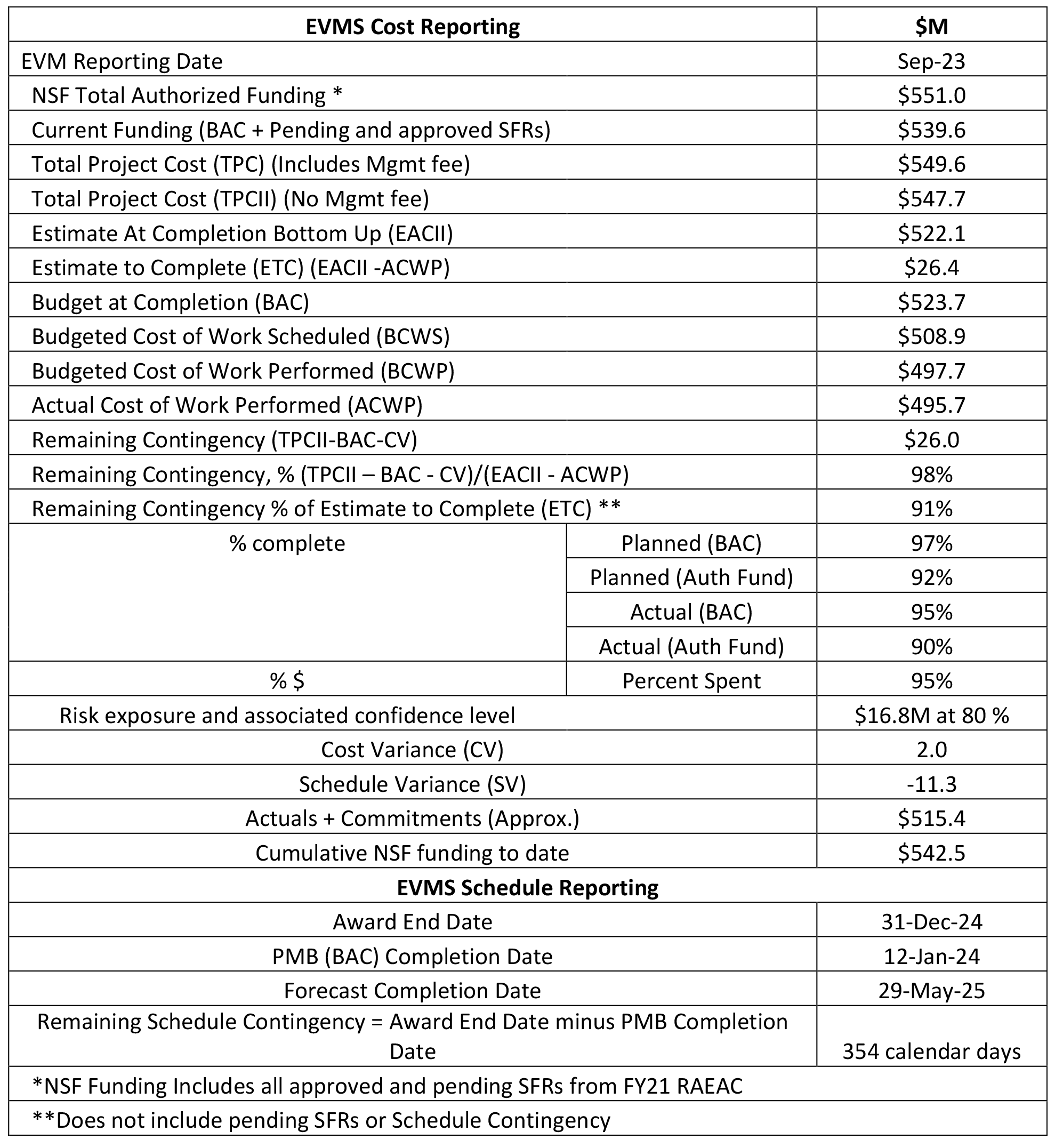 Project earned value toward the MREFC effort rose $3.5 million this month to a calculated $497.7 million. The cost variance changed by $0.3 million this month to $2.0 million, and the cost performance index held at 1.0. The schedule variance changed by $0.4 million to -$11.3 million, which equates to a schedule performance index of 0.98. Nine project controls change requests (LCRs) were implemented this month requesting a total of $654,620 from contingency. As of the end of the month, the project has allocated 74% of the total contingency to the baseline through the change control process. The remaining contingency of $24.02 million is 98% of (TPCII -BAC -CV)/(EACII -ACWP ).