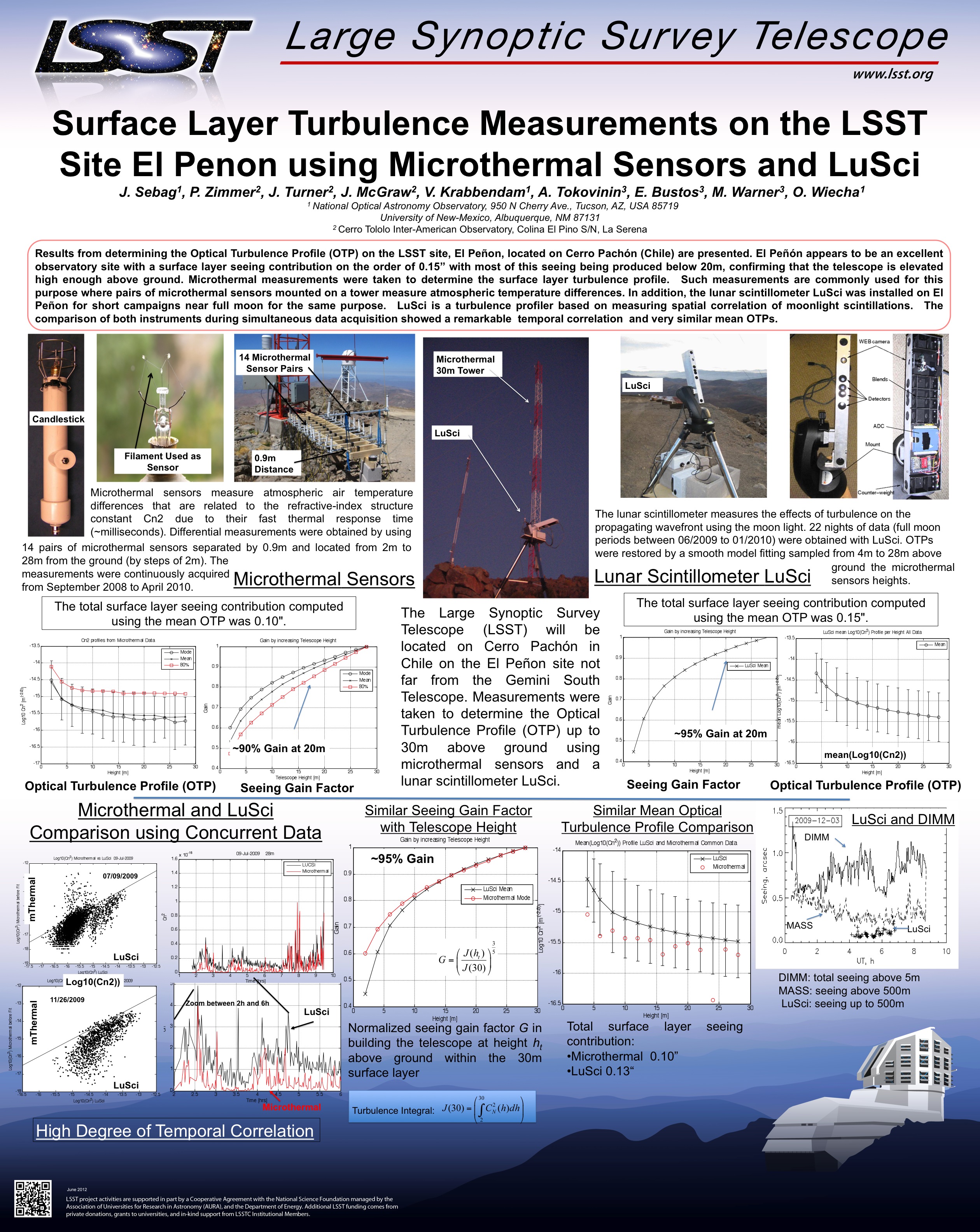 Surface layer turbulence measurements on the LSST site El Peñon using microthermal sensors and the lunar scintillometer LuSci, Jacques Sebag, National Optical Astronomy Observatory (USA); Peter C. Zimmer, Jonathan H. Turner, John T. McGraw, The Univ. of New Mexico (USA); Victor L. Krabbendam, National Optical Astronomy Observatory (USA); Andrei A. Tokovinin, Cerro Tololo Inter-American Observatory (Chile); Oliver Wiecha, National Optical Astronomy Observatory (USA) [8444-240]